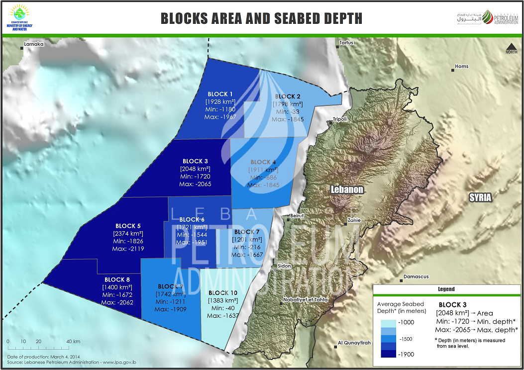 The area of the maritime waters subject to the Lebanese State jurisdiction is 22,730 Km2. However, there is a buffer zone along the coast with an area of 1,200 km2 where petroleum activities are not allowed. Click here to view the detailed blocks area and seabed depth.
